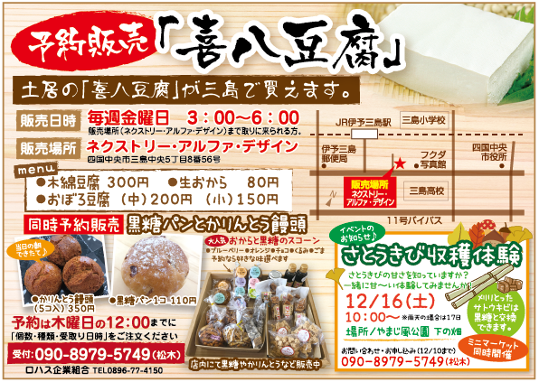 四国中央市三島のネクストリー・アルファ・デザイン様にてお豆腐などの予約販売をいたします。